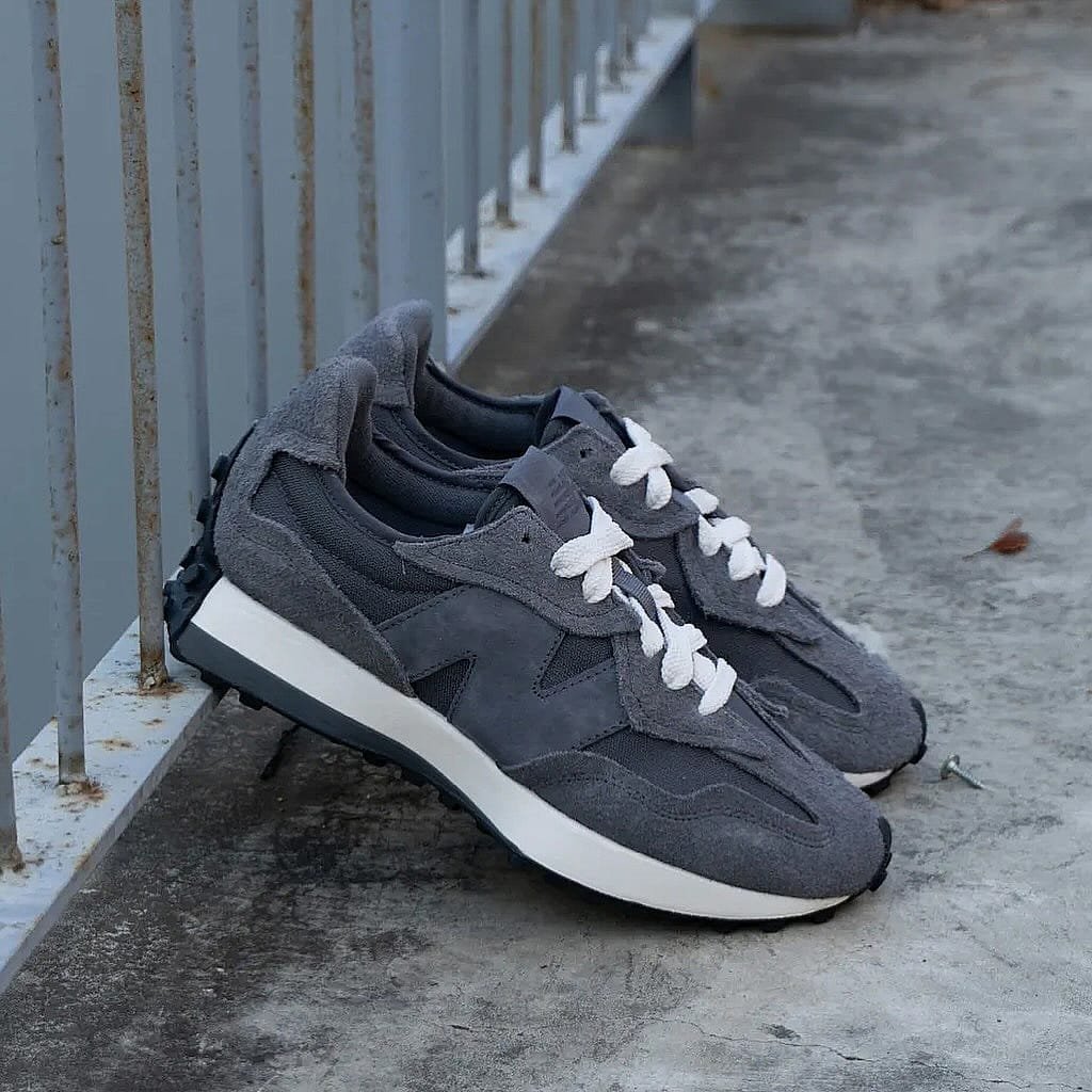 The New Balance 327 is a modern lifestyle sneaker that blends 1970s heritage running design with a contemporary aesthetic, a flared EVA midsole, and a distinctive trail-inspired lugged outsole that wraps the heel