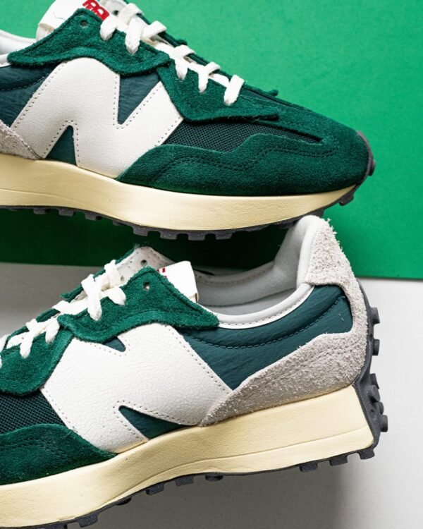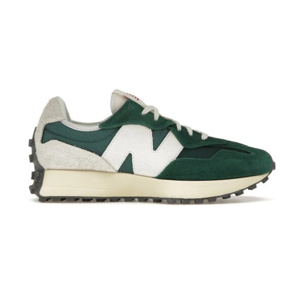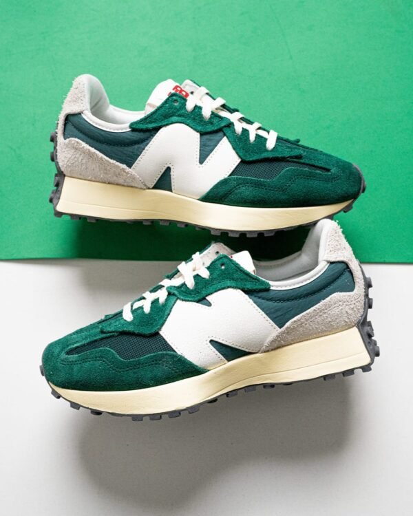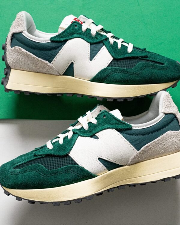 The New Balance 327 is a modern lifestyle sneaker that blends 1970s heritage running design with a contemporary aesthetic, a flared EVA midsole, and a distinctive trail-inspired lugged outsole that wraps the heel