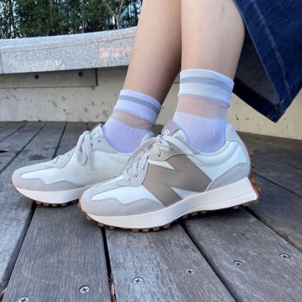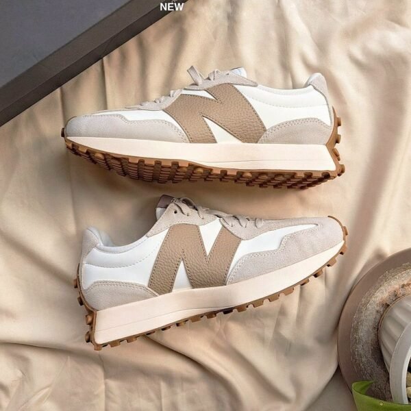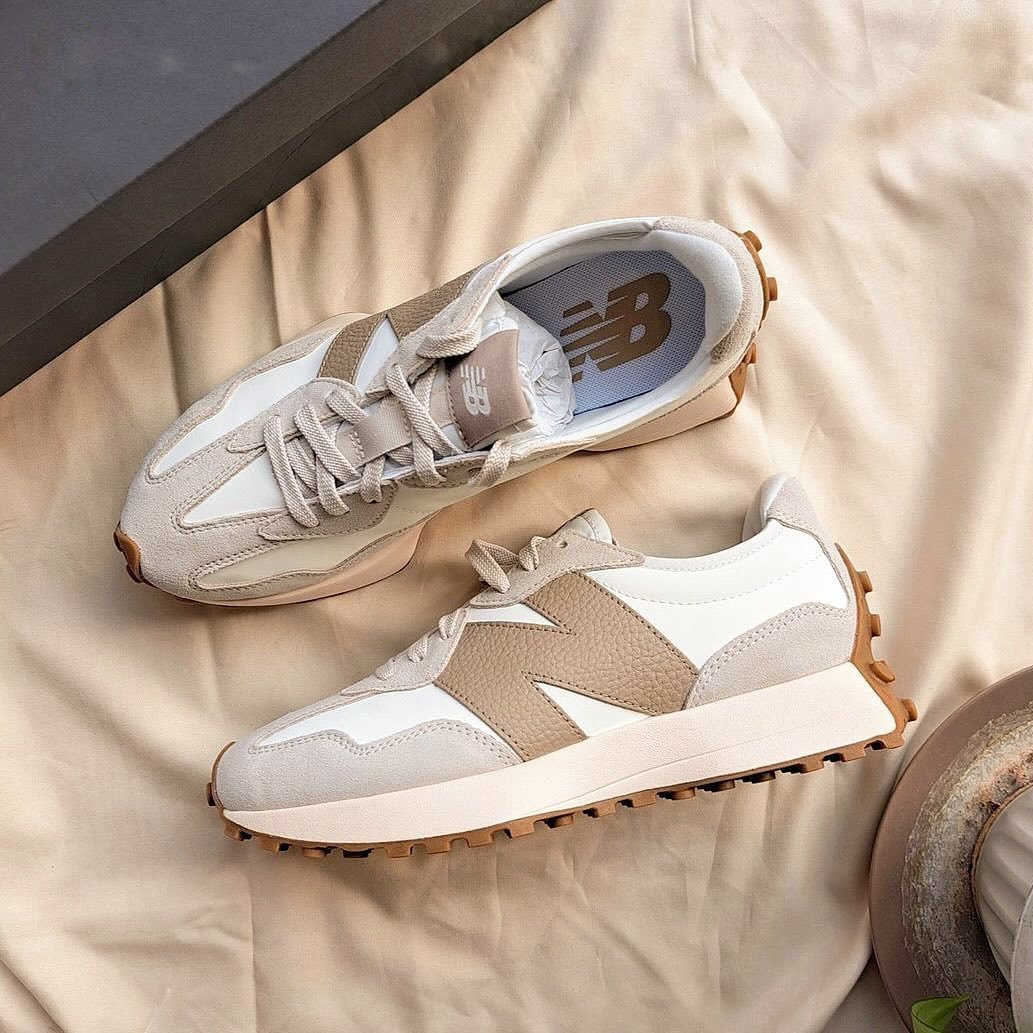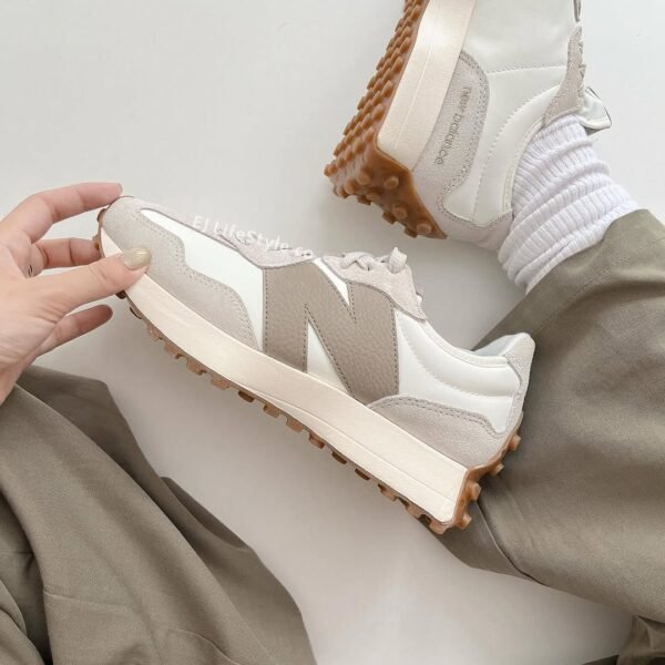 The New Balance 327 is a modern lifestyle sneaker that blends 1970s heritage running design with a contemporary aesthetic, a flared EVA midsole, and a distinctive trail-inspired lugged outsole that wraps the heel